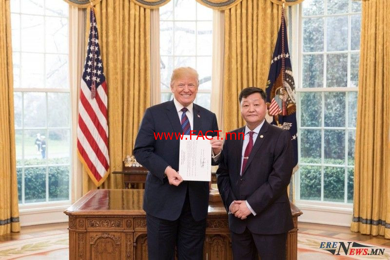 Өчигдөр Элчин сайд Ё.Отгонбаяр Итгэмжлэх жуух бичгээ АНУ-ын Ерөнхийлөгч Дональд Трампад гардуулсан талаар АНУ-д суугаа Монгол Улсын Элчин сайдын яамнаас мэдээлжээ.Түүний Трамптай хамт авахуулсан зургийг харсан хүмүүс: “Трамптай хамт зургаа даруулсан анхны монгол хүн бас л Булганых” гэлцэж байна.