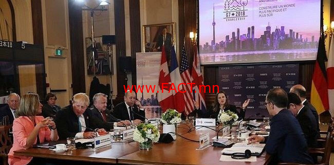 “Их 7”-гийн Гадаад хэргийн сайд нар Торонто хотноо уулзаж Москвагийн эсрэг хориг арга хэмжээгээ чангатгах талаар хэлэлцсэн байна. Торонтогийн тунхаглалд бичсэнээр, талууд Зүүн Украины нөхцөл байдалтай холбоотойгоор Оросын эсрэг нэмэлт хориг арга хэмжээ авахад бэлэн байгаагаа илэрхийллээ. Мөн “Их 7”-гийн бүлэг “Крымийн хойгийг зүй бусаар улс орондоо нэгтгэсэн” хэмээн Оросын эрх баригчдыг буруушааж, Украин улсын бодлогыг бүх талаар дэмжихийн хамт тус улсын нутаг дэвсгэрийн бүрэн бүтэн байдлыг сахин хамгаалахаа мэдэгджээ. Ийнхүү “Их 7”-гийн орнууд ОХУ-ыг дэлхийн нөхцөл байдлыг тогтворгүйжүүлж байгаад буруутгасан юм. Гэхдээ олон улсын тулгамдсан сэдвээр Москватай хамтран ажиллахад бэлэн гэдгээ дурдсан байна. Торонтогийн уулзалтад оролцсон Гадаад хэргийн сайд нар Оросын тал олон улсын гэрээгээр хүлээсэн үүргээ биелүүлж, үр ашигтай хамтын ажиллагаанд сөргөөр нөлөөлж байгаа асуудлаа шийдвэрлэхийг уриаллаа. Мөн Оросын эрх баригчдыг Минскийн гэрээгээр хүлээсэн үүргээ сахин биелүүлэхийг шаарджээ. Английн Гадаад хэргийн сайд Борис Жонсон “ОХУ- ын эсрэг дэлхийн бүх орон хориг арга хэмжээ авах ёстой. Оросын албан тушаалтнуудад Их Британийн виз олгохоос татгалзах, хөрөнгийг нь царцаах зэрэг арга хэмжээ авсан. С.Скрипаль болон түүний охин Юлияг ОХУ-д үйлдвэрлэсэн “Новичок” гэх тархи мэдрэл саажуулах үйлчилгээтэй химийн бодисоор хордуулсныг тогтоосон. Энэ хэргээ Оросын тал хүлээн зөвшөөрөх хэрэгтэй” гэсэн хатуухан байр суурь илэрхийлжээ. Их Британи улс Европын нутаг дэвсгэрийн бүрэн бүтэн байдлыг эрхэмлэн үзэх ба Крымийг Оросын нутаг дэвсгэр гэж хүлээн зөвшөөрөхгүй. Мөн Европын холбоо, АНУ- ын хооронд аж үйлдвэр, худалдааны хэлэлцээрийг түргэтгэхийг уриалж, гааль, худалдааны татвартай холбоотой шуугиан гарснаас хойш үүсээд буй нөхцөл байдлын талаар хөндөн ярьсан байна. “Их 7”-гийн бүлгийн орнуудын уулзалт хоёр өдөр үргэлжилсэн ч Сирийн асуудлаар тодорхой шийдэлд хүрэлгүй өндөрлөлөө.