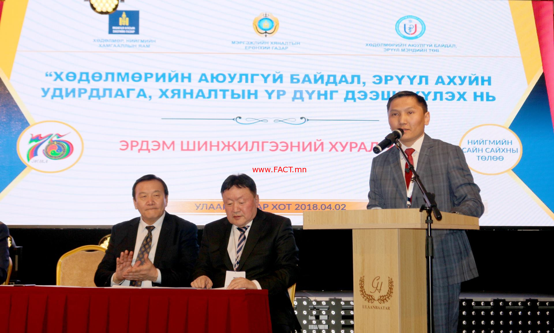 Энэ жилийн сарын аяны хүрээнд хийгдэж буй томоохон ажлын нэг болох “Хөдөлмөрийн аюулгүй байдал, эрүүл ахуйн удирдлага, хяналтын үр дүнг дээшлүүлэх нь” сэдэвт эрдэм шинжилгээний хурлыг Хөдөлмөрийн аюулгүй байдал, эрүүл мэндийн төв, МХЕГ-тай хамтран 2018.04.02-ны өдөр амжилттай зохион байгууллаа. Арга хэмжээний нээлтэд МХЕГ-ын дэд дарга Д.Энхсайхан, Хөдөлмөрийн аюулгүй байдал, эрүүл мэндийн төвийн дарга М.Даваабат нар мэндчилгээ дэвшүүлж илтгэгч нарт амжилт хүслээ.