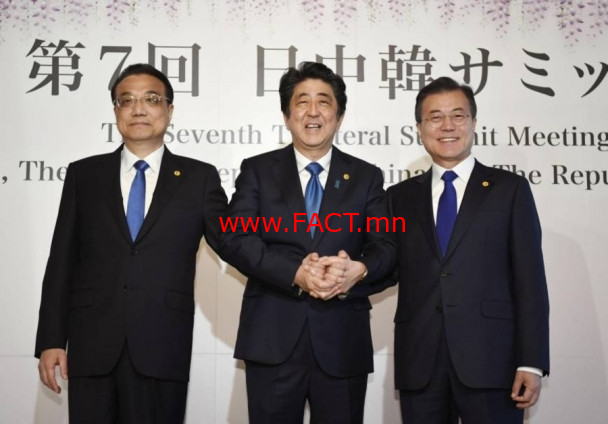 Японы Ерөнхий сайд Шинзо Абэ, БНХАУ-ын Төрийн Зөвлөлийн Ерөнхий сайд Ли Көцян, Өмнөд Солонгосын Ерөнхийлөгч Мүн Жэ Ин нар өнөө өглөө Токио хотноо 2015 оноос хойшхи тус гурван улс хоорондын анхны уулзалтыг хийсэн байна.