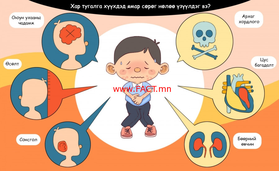 Цусан дахь хар тугалга дээрх нормоос дээш гарсан байх юм бол хүүхдүүд амархан уурлах, цочромтгой болох, анхаарал сулрах, ой тогтоолт муудах нь ихэсдэг байна. Хүүхдийн цусан дахь хар тугалгын агууламжид хөрсний хар тугалга 17.4, агаар дахь хар тугалга 34.2 хувь нөлөөлдөг аж.