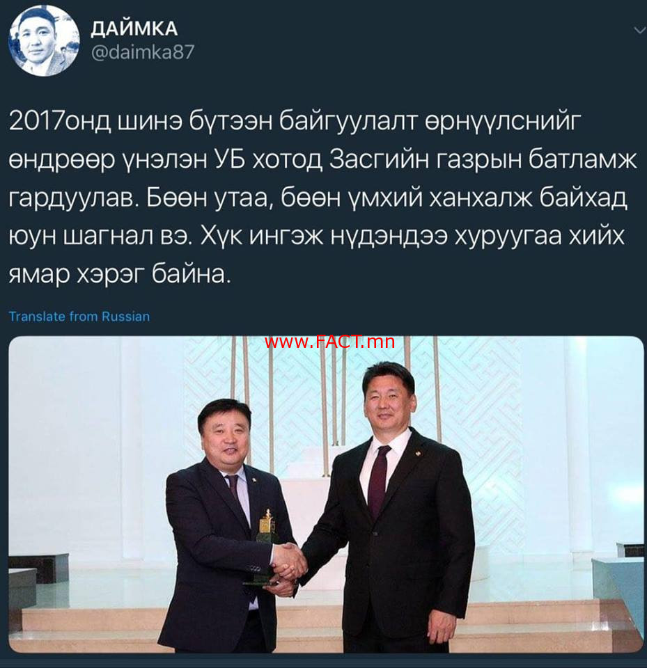 Товчхондоо хотын дарга С.Батболдын үйлдлүүд бүтээн байгуулалтын тухай бүү хэл ундуй сундуй, ойлгомжгүй гоомой байгааг олон нийт бүгд мэдэж, харж байна. Тийм атал Монгол улсын Ерөнхий бүтээн байгуулалт хийхээр ширхэг тоосго ч өрөөгүй хотын даргад “Шилдэг бүтээн байгуулалттай хот” хэмээх Засгийн газрын өндөр нэр хүндтэй шагналыг өгснийг ойлгох ухаан хайрла иргэд бидэнд.