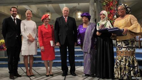 Норвегийн Осло хотноо өчигдөр Нобелийн энх тайвны шагнал гардуулах ёслол боллоо. Нобелийн энх тайвны 2011 оны шагналын эзнээр Либерийн Ерөнхийлөгч Эллен Жонсон Серлиф, эмэгтэйчүүдийн хөдөлгөөний тэмцэгч Леймах Гбови, Йемений ардчиллын төлөө тэмцэгч Тамаккол Карман нар шалгарчээ. Эдгээр эмэгтэйчүүд хүний эрх, аюулгүй байдлыг хамгаалахын тулд цусгүй тэмцэл өрнүүлсний төлөө Энх тайвны шагналын эзэд болсон билээ. 2010 онд Хятадын хуульч Лю Сябао Нобелийн энх тайвны шагналын эзнээр тодорч байсан. Нобелийн энх тайвны шагналыг алтан медаль, диплом, 1.5 сая ам.доллартай гардуулдаг уламжлалтай ажээ. Африкийн анхны ерөнхийлөгч эмэгтэй хатагтай Серлиф Либерийн иргэний дайны галыг унтраахаар хүчин зүтгэж яваа юм. Тэрбээр Либерийн ерөнхийлөгчийн сонгууль болохоос ердөө хэдхэн хоногийн өмнө энх тайвны нэр хүндтэй шагналыг авч байгаа ажээ. Тэрбээр Нобелийн энх тайвны шагнал хүртсэн Африк гаралтай хүмүүсийн үйлсийг үргэлжлүүлж байгаадаа бахархаж байгаагаа илэрхийлжээ. Өмнөд Африкийн арчбишоп Десмонд Туту, НҮБ-ын Ерөнхий нарийн бичгийн дарга асан Кофи Аннан нар өмнө нь энэ нэр хүндтэй шагналыг авч байсан юм.