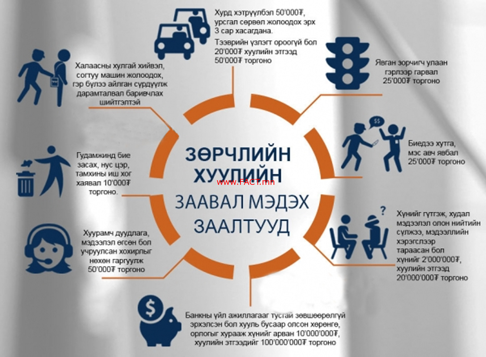 Зөрчлийн тухай хуулийг шинэчлэн 2017 оны тавдугаар сард баталснаас хойш нэг жил өнгөрчээ. Хуульд нийтдээ 1600 гаруй төрлийн зөрчлийг тусгасан. Зөрчлийн хууль хэд хэдэн хуулийн заалтуудыг “уруу татсан” нийлбэр шинж агуулгатай ч үндсэндээ бол Захиргааны хариуцлагын тухай хуулийн шинэчлэгдсэн хувилбар юм. Хариуцлага тооцох хэлбэр нь торгууль голлож байгаа бөгөөд хэрэгжиж эхэлсэн эхний хагас жилдээ гэхэд улсын төсөвт 22 тэрбум төгрөг оруулсан гэх мэдээлэл бий.