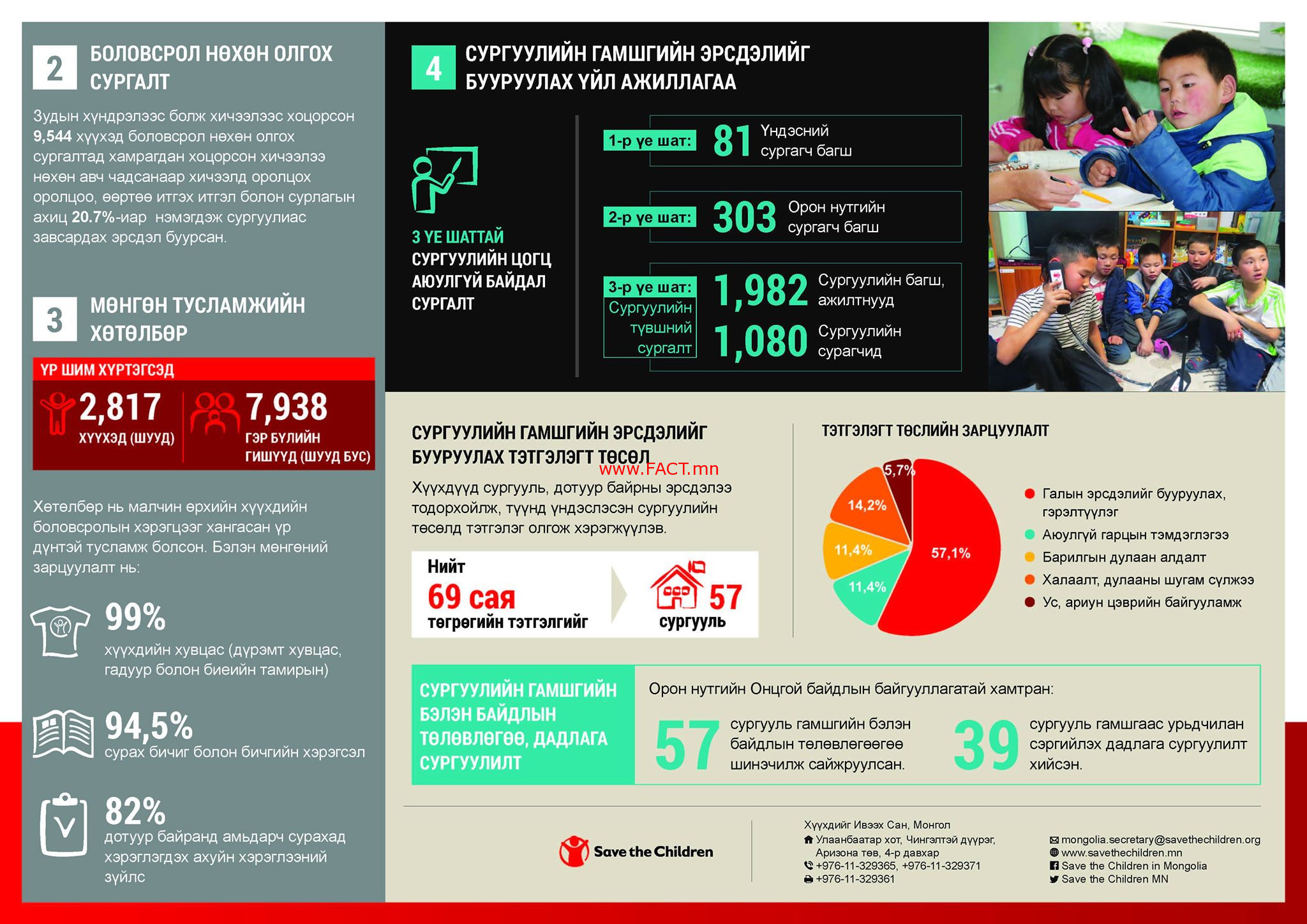 Эрхзүйн орчны хувьд гамшгаас хамгаалахтай холбоотой хэд хэдэн хууль тогтоомж, төрөөс баримтлах бодлого, Үндэсний хөтөлбөр байдаг. 2014 онд Онцгой байдлын ерөнхий газар нь “Гамшгаас хамгаалах үйл ажиллагаанд хүүхэд хамгааллын талаар баримтлах чиглэл”-ийг баталснаар ОБЕГ нь хүүхдийн эрхэм дээд, язгуур эрх ашгийг хамгаалах, хүүхдийн эрх зөрчигдөхөөс урьдчилан сэргийлэх, хүүхэд хамгааллын түншлэл, хамтын ажиллагааг хөгжүүлэх болон хүүхдэд ээлтэй, хүртээмжтэй, үр дүнд чиглэсэн мэргэжлийн үйлчилгээ үзүүлэх эрхэм үүргийг хүлээсэн.