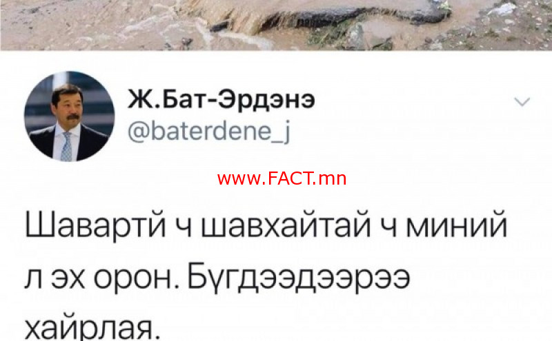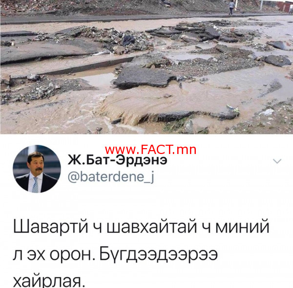 Тусгаар тогтсон улс орны Зам, тээврийн бодлогыг шууд байдлаар хариуцан ажиллаж буй сайд хүн борооны улирлын үеэр ингэж жиргэсэн нь олон нийтийн бухимдлыг төрүүлсэн билээ. Сошиал орчинд “Хоёр өгүүлбэр холбоод зөв бичиж чадахгүй хүн улс орны зам тээврийн бодлогыг хариуцаж ажиллаж чадах уу”, “Замаа сайжруулъя, шинээр тавья” гэж ярихын оронд салбарын сайд нь ингэж бичих гэж дээ” гэхчилэн шүүмжилсэн юм.