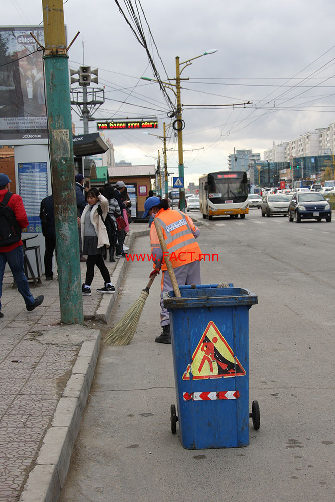 Өдгөө нийслэлийн төв гудамж, гол авто зам гээд 50 мянган ам метр талбайг Хот тохижилтын газрын 320 гаруй үйлчлэгч цэвэрлэж байгаа гэнэ. Төв замын цэвэрлэгээг хариуцдаг хэд хэдэн хүнтэй уулзсан юм. Тэдний хэлж буйгаар зам, талбайн үйлчлэгчдийн тоо цөөрчээ. Мөн авдаг цалин нь ч багасаж. Энэ талаар нэрээ нууцлахыг хүссэн нэгэн үйлчлэгч “Би урьд нь “Улаанбаатар нэгтгэл”-д гурван сар ажилласан. Тухайн үед биднийг 05.00-06.00 цагийн үед ажил эхлэх үүрэг өгдөг байв. Ингэхдээ ажилчдаа байгууллагын унаагаар зөөж, цэвэрлэх газруудад нь хүргэдэг. Би л гэхэд 06.00 цагт ажлаа эхлээд хариуцсан нэг км замаа цаг гаруйн хугацаанд цэвэрлэж дуусгадаг байлаа” хэмээн ярьсан юм.