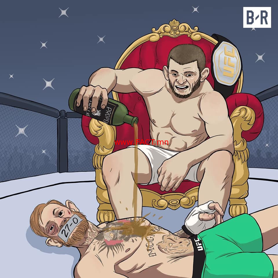Харин Конор: “Хүлээж чадалгүй хулчийгаад гараад явчихсан уу? Хабиб маш олон сул талтай. Тэр Дагестаных болохоор зөвхөн барилдаж л чаддаг. Тэр багадаа баавгайтай ноцолдож өссөн байж болно. Тэр сайн бөх. Үнэхээр сайн. Гэхдээ тулаан бол бөхийн барилдаан биш. Би түүнийг дөнгөх болно. Тэр баавгайтай ноцолдож үзсэн ч ирланд гориллтой бол тэмцэлдэж чадах ч үгүй” хэмээн Конор Макгрегор өгүүлж байжээ.