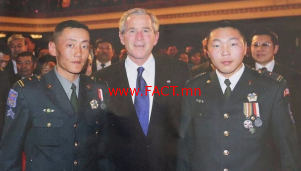 2004 онд Иракт олон үндэстэний цэргийн бааз руу тонн шахам тэсрэх бодистой дайран орж ирсэн алан хядагчдын духанд монгол цэргийн сум зоож газар дээр нь тэсрэх бодистой нь дэлбэлэн устгаж бааз дээр байсан хэдэн мянган цэрэг эрсийн амийг аварсан Аззаяа, Самбуу-Ёндон нарын баатаруудад Америкийн ерөнхийлөгч Жорж Буш Монголд ирэхдээ биечлэн баяр хүргэн монгол цэргийн эрэмгий зоригийг шагшран магтаад Ийм эрэлхэг монгол цэргүүдээр хамгаалуулсан америк цэргүүд хаа ч байсан тайван унтаж чадна гэдгээ итгэлтэйгээр илэрхийлээд буцсан байдаг\ зураг дээр\.