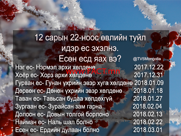 Монголчууд эртнээс өвлийн улирлын ид хүйтний үеийг есөн ес хоногоор нь нэрлэж ирсэн түүхтэй. Энэ үечлэл нь 12 дугаар сарын 22-нд эхэлдэг юм. Энэ өдөр хүйтний эрч чангарч, хамгийн урт шөнө, хамгийн богино өдөр тохиодог байна.