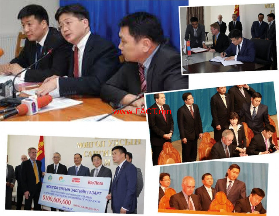 Нийтдээ гурван гэрээ зурсан байдаг. Эхний гэрээ болох Хөрөнгө оруулалтын гэрээнд Монголын талыг төлөөлж Хөрөнгө оруулагчтай хэлэлцээ хийх ажлын хэсгийн ахлагч Эрдэс баялаг, эрчим хүчний сайд Д.Зоригт, ажлын хэсгийн гишүүн, Сангийн сайд С.Баярцогт, Байгаль орчин, аялал жуулчлалын сайд Л.Гансүх, хөрөнгө оруулагчдыг төлөөлж “Рио Тинто Интернэшнл Холдингс Лимитед” компанийн Зэс, очир эрдэнийн бүлгийн ерөнхий захирал Брет Клейтон, “Айвенхоу майнз Монголия Инк” ХХК-ийн ерөнхий захирал Кийт Маршал, “Айвенхоу Майнз Лимитед” компанийн ТУЗ-ийн дэд дарга Питер Мередит нар гарын үсэг зурсан юм.