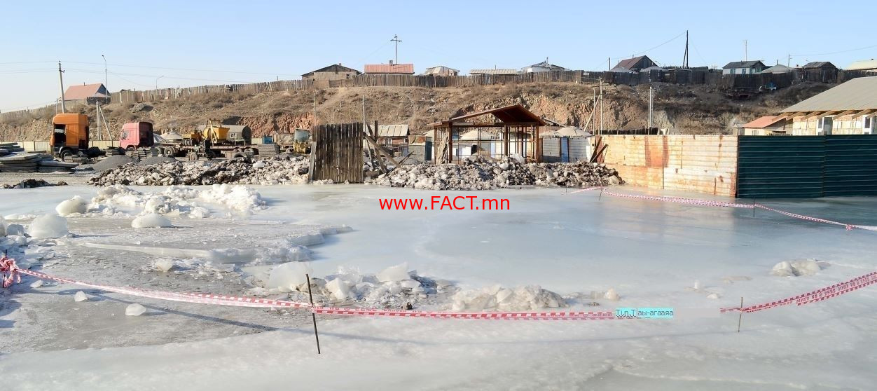 Станцын хойд хэсэгт хэд хэдэн булаг ундарч дутуухан барьсан үерийн далан их хэмжээний усанд автсанаас болж халиа дош бий болжээ. Долоо хоногийн өмнө нийслэлийн удирдлагууд, албаныхан далан хальж хөлдсөн их хэмжээний мөсөн “нуур”-тай танилцсан ч өчигдрийн байдлаар ямар нэг арга хэмжээ аваагүй байлаа. Их хэмжээний мөс үүссэн энэхүү бүсэд биднийг очиход үнс, элс, шуудайлсан шороо гэмээр зүйлсээр халиа, цутгалыг станцын хашаанаас тусгаарлан хаалт хийсэн байв.
