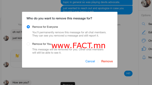 Харин мессэжийг илгээгээд 10 минутаас хэтэрсэн бол “Remove” комманд нь зөвхөн өөрийн цонхноос устгах нөхцлийг санал болгодог.