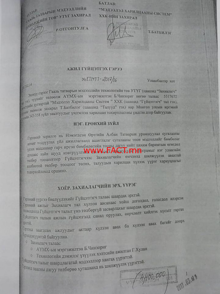Түүний хувийн компани болох “Мэдээлэл харилцааны систем” ХХК-ийн “Гааль, татварын мэдээллийн технологийн төв” УТҮГ-тай хийсэн гэрээний хуулбарыг хавсаргав.