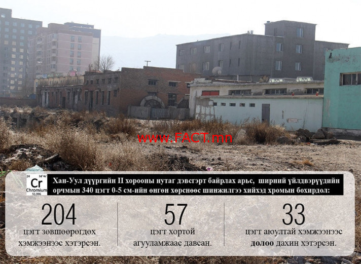 Судалгааны хүрээнд энэ орчмын 340 цэгээс дээж авч шинжлэхэд 204 цэгт хромын бохирдол зөвшөөрөгдөх хэмжээнээс хэтэрсэн, 57 цэгт стандартын хортой агууламжаас давсан, 33 цэгт аюултай хэмжээнээс долоо дахин хэтэрсэн үзүүлэлттэй байгаа юм.