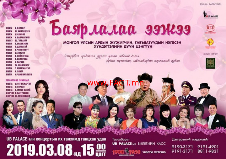 Жил бүрийн 3 сарын 8-ны өдөр буюу Олон улсын эмэгтэйчүүдийн эрхийг хамгаалах өдөр иргэд маань ээжүүдээ, эмэгтэйчүүдээ баярлуулдаг сайхан уламжлал тогтоод удаж байна. Үүнтэй холбоотойгоор 3 сарын 8-ны өдөр болох урлаг соёлын арга хэмжээнүүд эрэлт ихтэй байдаг билээ.