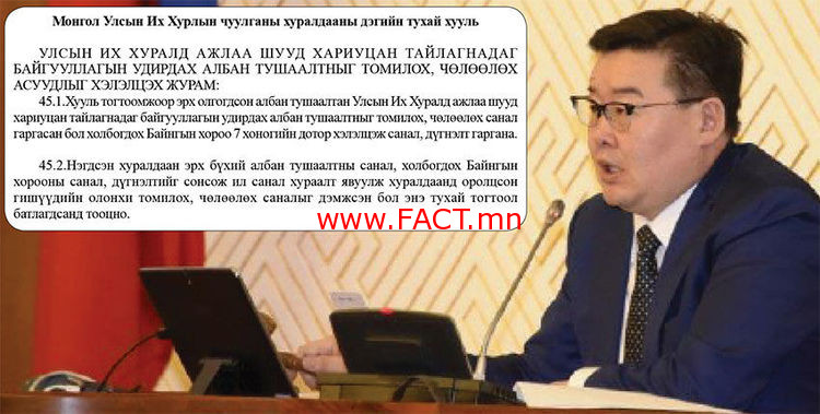 Тухайлбал УИХ-ын Дэгийн хуульд УИХ-д ажлаа шууд харилцан тайлагнадаг байгууллагын удирдах албан тушаалтныг томилох, чөлөөлөх асуудлыг хэлэлцэхдээ тус хуулийн 45.1, 45.2 -ээр зохицуулна гэсэн байдаг. 45.1-д УИХ-д ажлаа шууд хариуцан тайлагнадаг байгууллагын удирдах албан тушаалтныг томилох, чөлөөлөх санал гаргасан бол холбогдох Байнгын хороо долоо хоногийн дотор хэлэлцэж санал, дүгнэлт гаргана. Түүнчлэн 45.2-д Нэгдсэн хуралдаан эрх бүхий албан тушаалтны санал, холбогдох Байнгын хорооны санал, дүгнэлтийг сонсож ил санал хураалт явуулж хуралдаанд оролцсон гишүүдийн олонхи томилох, чөлөөлөх саналыг дэмжсэн бол энэ тухай тогтоол батлагдсанд тооцно гэжээ. Тэгэхээр яах аргагүй АТГ-ын даргыг чөлөөлөх асуудлыг эхэлж чуулганаар хэлэлцэх учиртай болж байна.