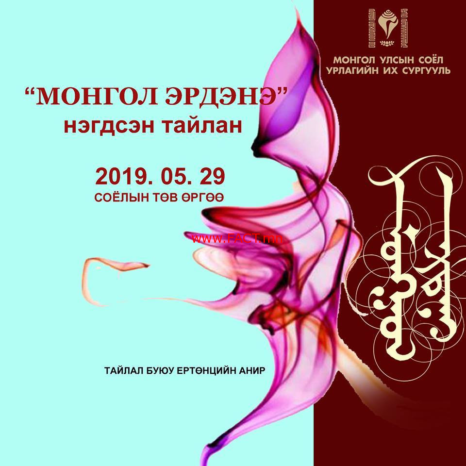 Монгол Улсын Соёл урлагийн их сургуулийн сургалт, эрдэм шинжилгээ, уран бүтээлийн “МОНГОЛ ЭРДЭНЭ” нэгдсэн тайлан тоглолт, үзэсгэлэн 2019 оны 5 дугаар сарын 29-ний 17:00 цагт “Соёлын төв өргөө”-нд болно. Нэгдсэн тайланд: