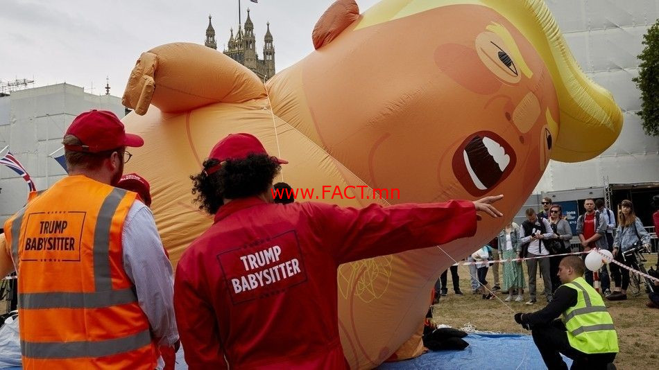 Өнгөрсөн онд Трампыг айлчлах үеэр жагсагчид “The Trump Baby” нэртэй, живх зүүсэн хүүхэд хэлбэртэй, аварга том хийлдэг дүрс хөөргөж байв. Өчигдөр энэхүү дүрсийг хийлж, дахин хөөргөхөөр бэлдэж байх үед нэгэн эмэгтэй халдаж, хурц ирмэгтэй зүйлээр хагалсан байна. Тэрээр Дональд Трампыг дэмжигч Британийн иргэн Эми Далла Мура гэгч байжээ.