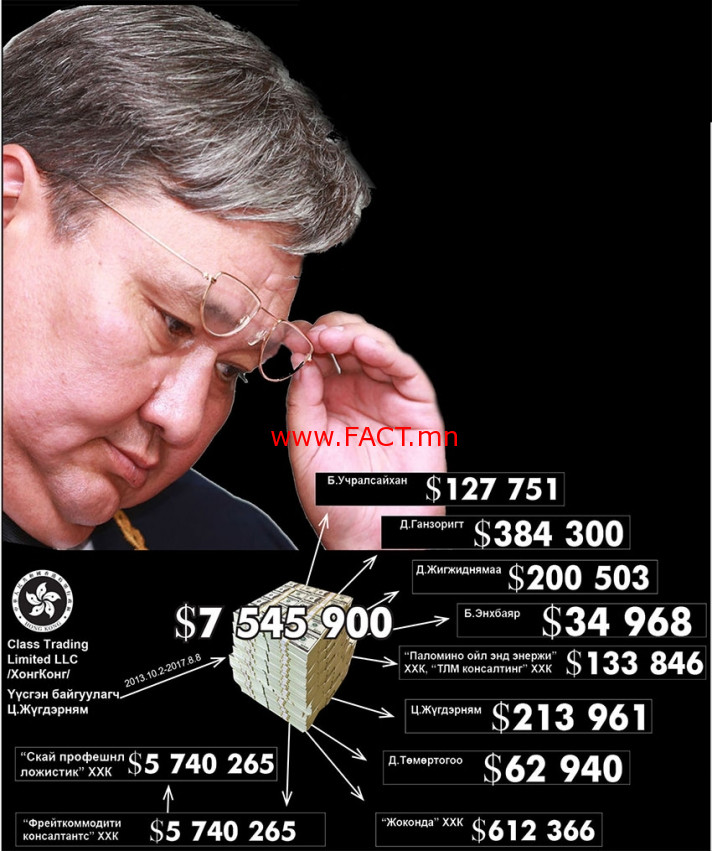 Энэ удаад Хонгконг дахь “Class Trading Limited” компаниас олон сая ам.доллар Монголд орж ирээд хэрхэн хуваагдсан мэдээллийг хүргэх гэж байна. Тодруулбал, Ц.Жүгдэрнямын Хонгконг дахь “Class Trading Limited” компани 2013 оны аравдугаар сарын 2-ноос 2017 оны наймдугаар сарын 8-ны өдрийг хүртэл Монгол Улсад 7 545 900 ам.долларыг шилжүүлэн ирүүлсэн байна. Өөрөөр хэлбэл, Class Trading Limited компанийн эдгээр гадаад гүйлгээ Д.Жигжиднямааг УБТЗ-ын дарга болсноос хойш үргэлжилж л байсан гэсэн үг.