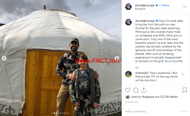 АНУ-ын Ерөнхийлөгч Дональд Трампын ууган хүү Дональд Трамп Жуниор хүүгийнхээ хамт өнгөрсөн долоо хоногийн эхээр Монгол Улсад хувийн аяллаар ирээд байсан билээ.