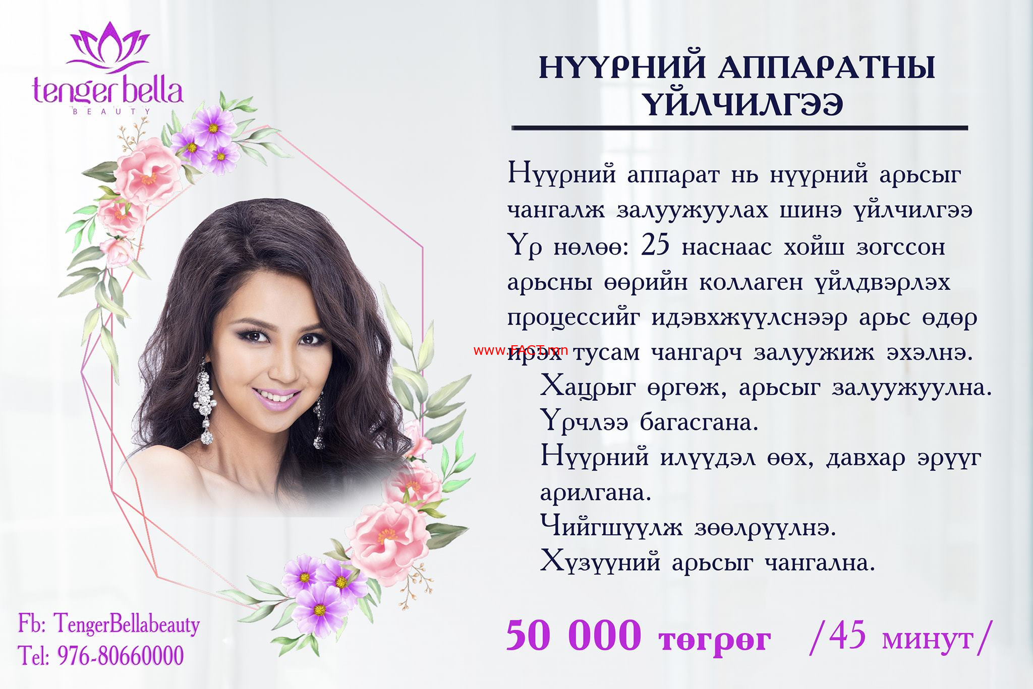 “Tenger bella baeuty” салон таны асуудлыг богино хугацаанд шийдвэрлэх гайхалтай үйлчилгээнүүдээ танилцуулж байна. Уг салоноос нэвтрүүлж буй нүүрний аппаратны үйлчилгээ нь арьсны коллаген үйлдвэрлэх процессийг идэвхижүүлснээр арьс чангарч, залуужиж эхэлдэг.