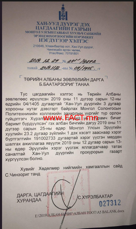Монгол, Солонгосын хамтарсан Политехникийн коллежийн захирлын үүргийг түр орлон гүйцэтгэгч Х.Цэгмидийг хуурамч бичиг баримт бүрдүүлсэн хэргээр Хан-Уул дүүрэг дэх Цагдаагийн газрын нэгдүгээр хэлтэст шалгаж байгаа аж.