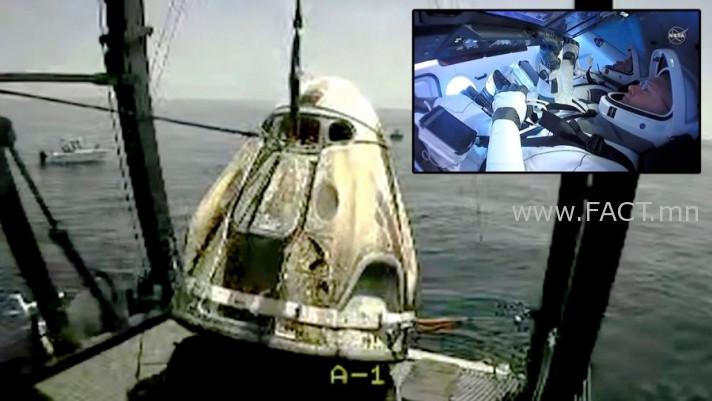 НЬЮ-ЙОРК. /TASS/. Сансрын нисгэгч Даглас Хёрли, Роберт Бенкен нарын жолоодсон Америкийн Crew Dragon сансрын хөлөг Мексикийн буланд, Флорида муж улсын эргээс холгүй газарт далайн усан дээр буулаа.
