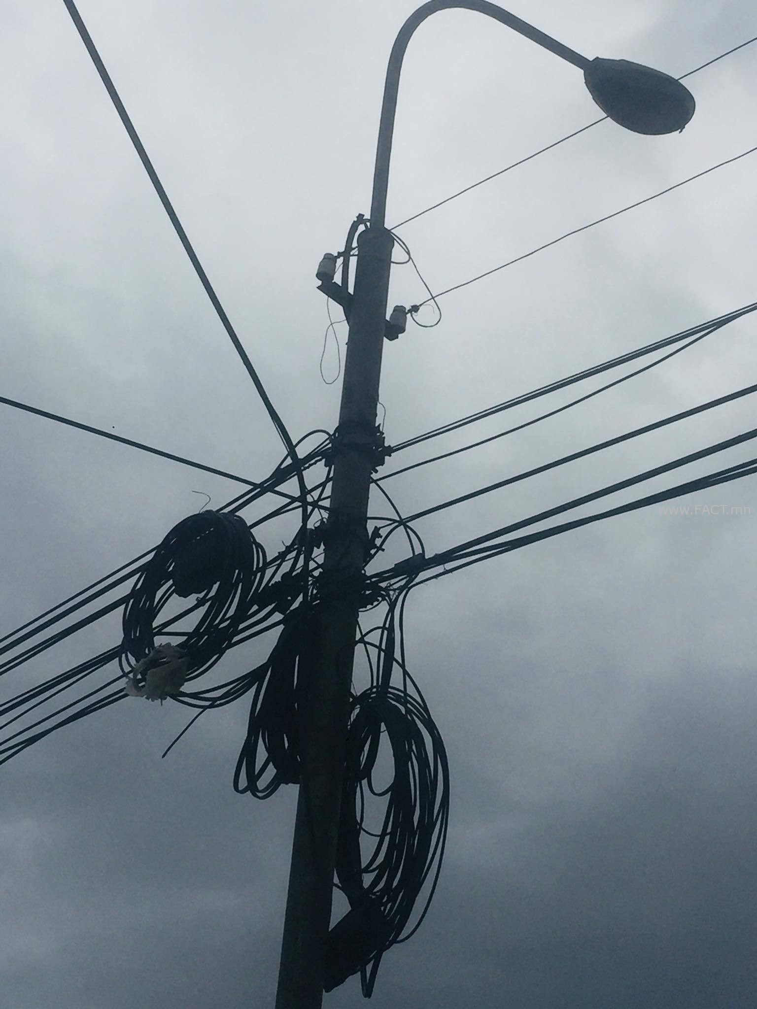 Сүхбаатар дүүргийн X дугаар хороо “Жоби” барилгын материалын дэлгүүрийн орчим, VII хороо буюу XI хорооллын хавьцаа, VIII хороо буюу “Ардын эрх” сонины буудал гээд Их тойруугийн зам дагуу гэрлийн шонд өлгөсөн кабелийн утас аюултай чиг, үзэмжгүй чиг орооцолдоно. Ялангуяа газар доогуурх цахилгааны сүлжээгээр хүчдэл гүйдэг, гэрлийн шонгийн монтажны таг унаж, утаснууд ил харагдах нь эрсдэлтэй. Гэрлийн шонгийн зарим утас хүний гар хүрэхээр унжсан нь ч харагдана. Мөн орон сууцны нэг давхарт үйлчилгээ эрхэлдэг аж ахуйн нэгжүүдийн рекламны самбар, гадна камер, гэрэлтүүлэг, цахилгаан, кабелийн өнгө өнгийн, нарийн бүдүүн утаснууд эмх замбараагүй орооцолдоно. Зарим нь илүүдсэн утсаараа цонхныхоо төмөр хаалтыг ороосон байв.