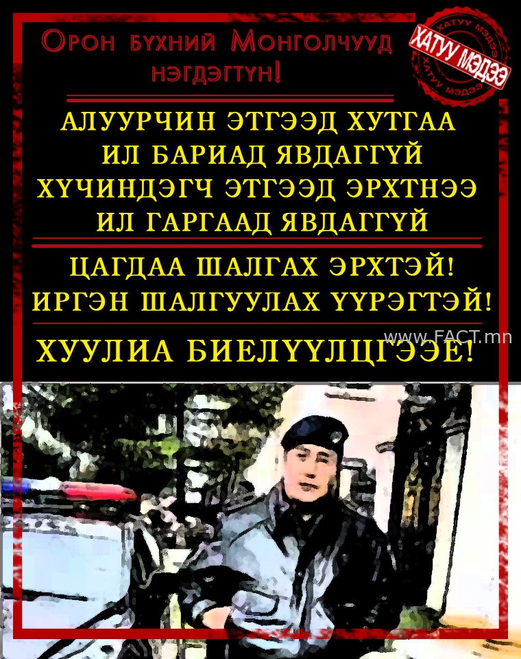 Хэн нэгнийг шалгаснаар та бидний тайван амьдралын баталгааг бий болгож буй Цагдаагийнхаа Зөв шаардлагыг биелүүлж амьдарцгаая!