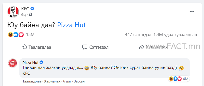 Өнөөдөр KFC брэнд “Юу байна даа?” Pizza hut” гэсэн постыг өөрийн албан ёсны цахим хуудаснаа оруулсан нь нэгэн сонирхолтой бөгөөд хөгжилтэй сошиал давалгааг эхлүүлэв. Уншигч та ньюсфийдээ гүйлгэж байхдаа ”Юу байна даа?” гэсэн пост олныг харсан байх. Тэгвэл та ч гэсэн ийм байдлаар ойр дотно хүмүүсээсээ мэнд мэдэж, сонин сайхнаа хуваалцаарай.