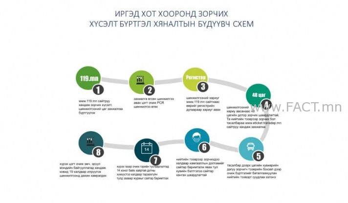 1. Иргэн та гар утас болон цахимаар www.119.mn-руу орж Улаанбаатар хотоос орон нутагт зорчих, орон нутгаас нийслэл хот руу зорчих болон аймаг, сум хооронд зорчих хүсэлт бүртгэх, шинжилгээ өгөх газраа сонгож, цаг товлоно.