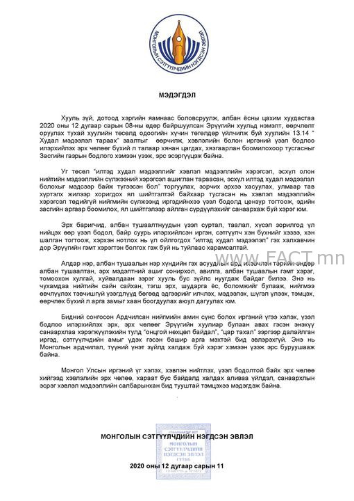 Монголын сэтгүүлчдийн нэгдсэн эвлэл Эрүүгийн хуульд нэмэлт, өөрчлөлт оруулахаар зэхэж буй алхмыг эсэргүүцэж, цензурийн эсрэг, Үндсэн хуулиар хамгаалагдсан иргэний үзэл бодолтой байх, итгэл үнэмшилтэй байх, үг хэлэх, хэвлэн нийтлэх эрх, эрх чөлөөний төлөө нэгдэхийг уриалж байна!
