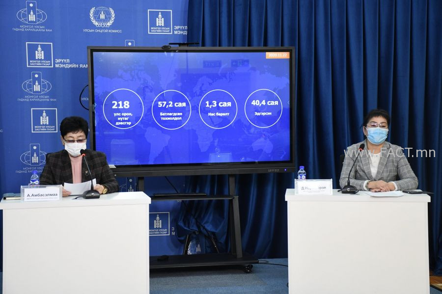 Улсын хэмжээнд нийт батлагдсан тохиолдол 1215, эдгэрсэн 830, эмчлэгдэж байгаа 375 байна. Үүнээс 267 хөнгөн, 99 хүндэвтэр, 7 хүнд, 2 хүн маш хүнд байна. Сүүлийн 24 цагийн дотор 6 хүн эдгэрч эмнэлгээс гарлаа” гэлээ.