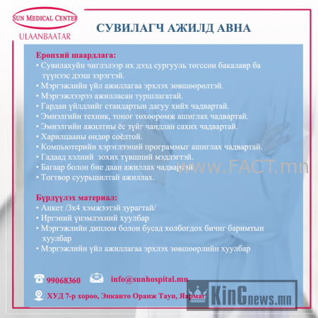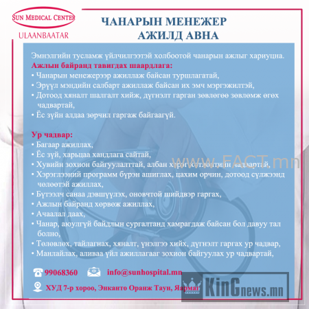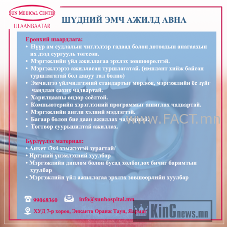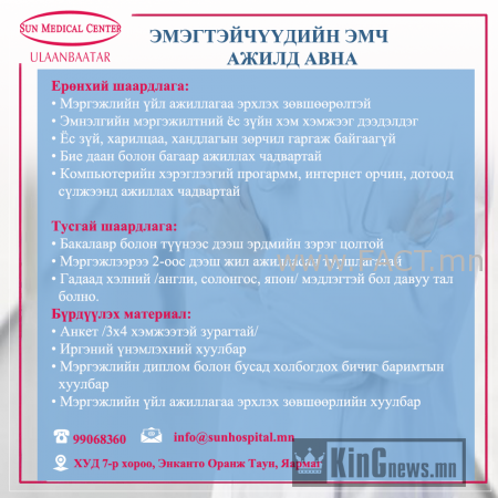БНСУ-н “Сон Медикал Центр” эмнэлэг Нээлттэй ажлын байранд таныг урьж байна