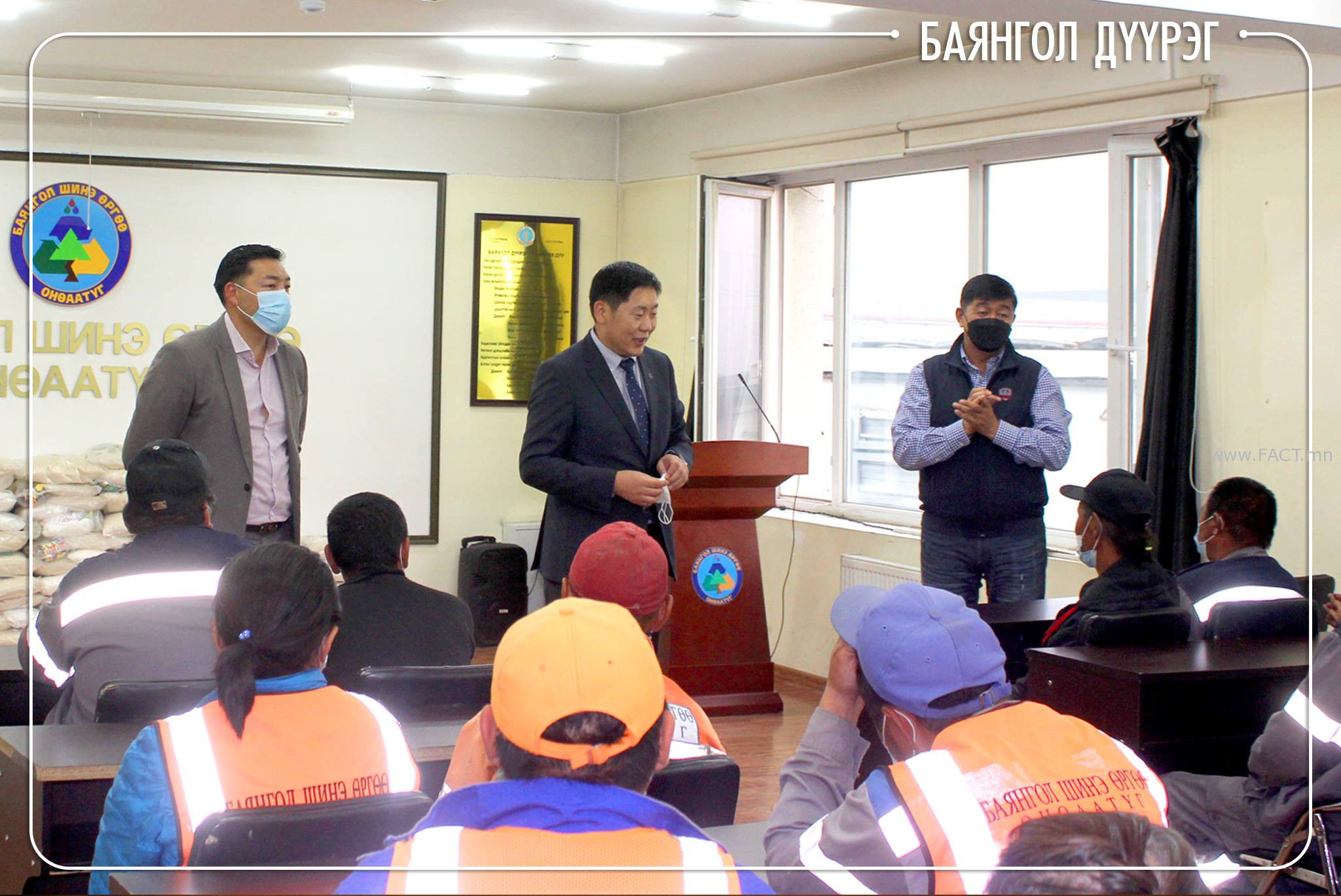 Түүнчлэн дүүргийн Засаг дарга тус газарт ажиллах үеэрээ “Баянгол шинэ өргөө”-гийн ажилтан, албан хаагчдад 3000 амны хаалт мөн ТҮК-ийн 116 ажилтанд хүнсний багц олгох дэмжлэг үзүүлснээ хүлээлгэж өгсөн юм.