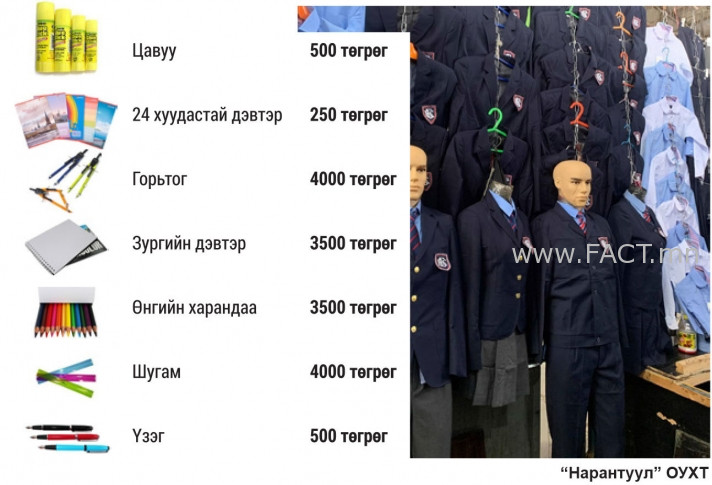 Харин “Бүтээлч Үйлс”, “Торгон хийц” компаниас гаргаж буй бага ангийн сурагчийн эрэгтэй хүрэм 52 мянга, өмд 36 мянга, зангиа дөрвөн мянга, эмэгтэй форм 59 мянган төгрөг. Мөн дунд ангийн эрэгтэй хүрэм 68 мянга, эмэгтэй хүрэм 65 мянга, охидын юбка 37 мянга, өмд 43 мянга, ахлах ангийн дүрэмт хувцасны хүрэм эрэгтэй 89 мянга, эмэгтэй 83 мянган төгрөг бол юбка 39 мянга, өмд 49 мянган төгрөг. Бага ангийн дүрэмт хувцасны цамц 25 мянган төгрөгөөр борлуулагдаж байгаа бол дунд ангийнх 27 мянга, ахлах ангийнх 29 мянган төгрөг байна. Энэ компанийн гаргаж буй дүрэмт хувцсыг Алтжин бөмбөрөг, Баялаг ундраа төв, Яармагийн Оргил худалдааны төв, УИД-ийн гадаа талбайгаас худалдаж авах боломжтой.