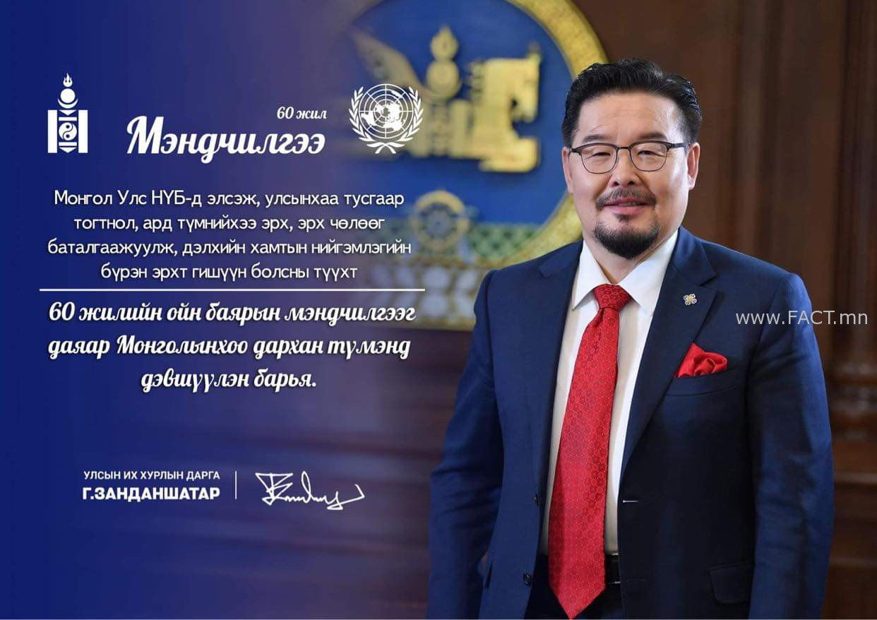 УИХ-ын дарга Г.Занданшатар Монгол Улс НҮБ-д элсэж, улсынхаа тусгаар тогтнол, ард түмнийхээ эрх, эрх чөлөөг баталгаажуулж, дэлхийн хамтын нийгэмлэгийн бүрэн эрхт гишүүн болсны түүхт 60 жилийн ойн баярын мэндчилгээг даяар Монголынхоо дархан түмэнд дэвшүүллээ.