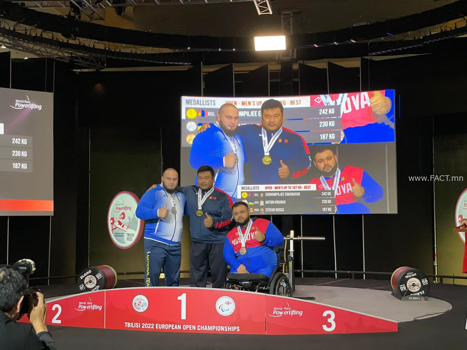 Тэрбээр тэмцээний 107 кг-ын жинд цээжнээс 242 кг-ыг шахсанаар алтан медаль хүртэж, Тбилист төрийн дууллаа эгшиглүүлэв