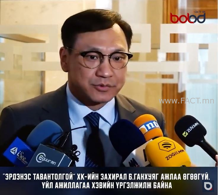 Засгийн газрын өчигдрийн хуралдаанаар “Эрдэнэс Тавантолгой” ХК-д онцгой дэглэм тогтоож, Засгийн газрын эрх бүхий төлөөлөгчөөр Сангийн яамны Төрийн нарийн бичгийн дарга Ж.Ганбатыг томилсон. Түүнийг ажлаа авсан даруйдаа “Эрдэнэт Тавантолгой” ХК-ийн гүйцэтгэх захирал Б.Ганхуягийг үүрэгт ажлаас нь чөлөөлж, тамгыг нь хурааж авсан гэх мэдээлэл гарсан. Тэгвэл энэ талаар Б.Ганхуяг “Эрдэнэс Тавантолгой” бол хувьцаат компани. Өөрийн гэсэн хувьцаа эзэмшигчидтэй. Төр бол 81.7 хувийг нь эзэмшдэгийн хувьд төрийн гаргасан шийдвэрийг шууд биелүүлнэ. Дөрвөн асуудал бий. Нэгдүгээрт, валютын нөөцийн орлогыг нэмэгдүүлэх асуудал “Эрдэнэт Тавантолгой” ХК гол эх сурвалжийн нэг учир анхаарал хандуулж ажиллаж байна. Мөн Эдийн засгийн хөгжлийн сайд болон “Эрдэнэс Тавантолгой” ХК-наас гаргасан тоон мэдээллүүд зөрж байгаа. Гаалийн бүртгэлээр гараад борлогдсон нүүрстэй холбоотой асуудал байсан. Энэ тоон мэдээ бол наймдугаар сарын 30-ны байдлаар 6.7 сая экспортлогдсон байна. Үүний 3.1 тонн нь 2021 оны нүүрс, 1.5 сая тонн 2020 оны нүүрс. Учир нь эдгээр онд коронавирус гарсан учир их хэмжээний экспортын төвлөрөл бий болсон. Бүрэн эрхт төлөөлөгчийн хувьд хамтарч ажиллана. Ямар нэгэн үл ойлголцол байхгүй. Компанийн үйл ажиллагаанд дэм болох үүднээс мэдээллээр хангаад явж байна. Тамга надад байдаггүй. Тамгын газрын даргад байдаг. Талууд хамтраад урагшаа явна” гэв.