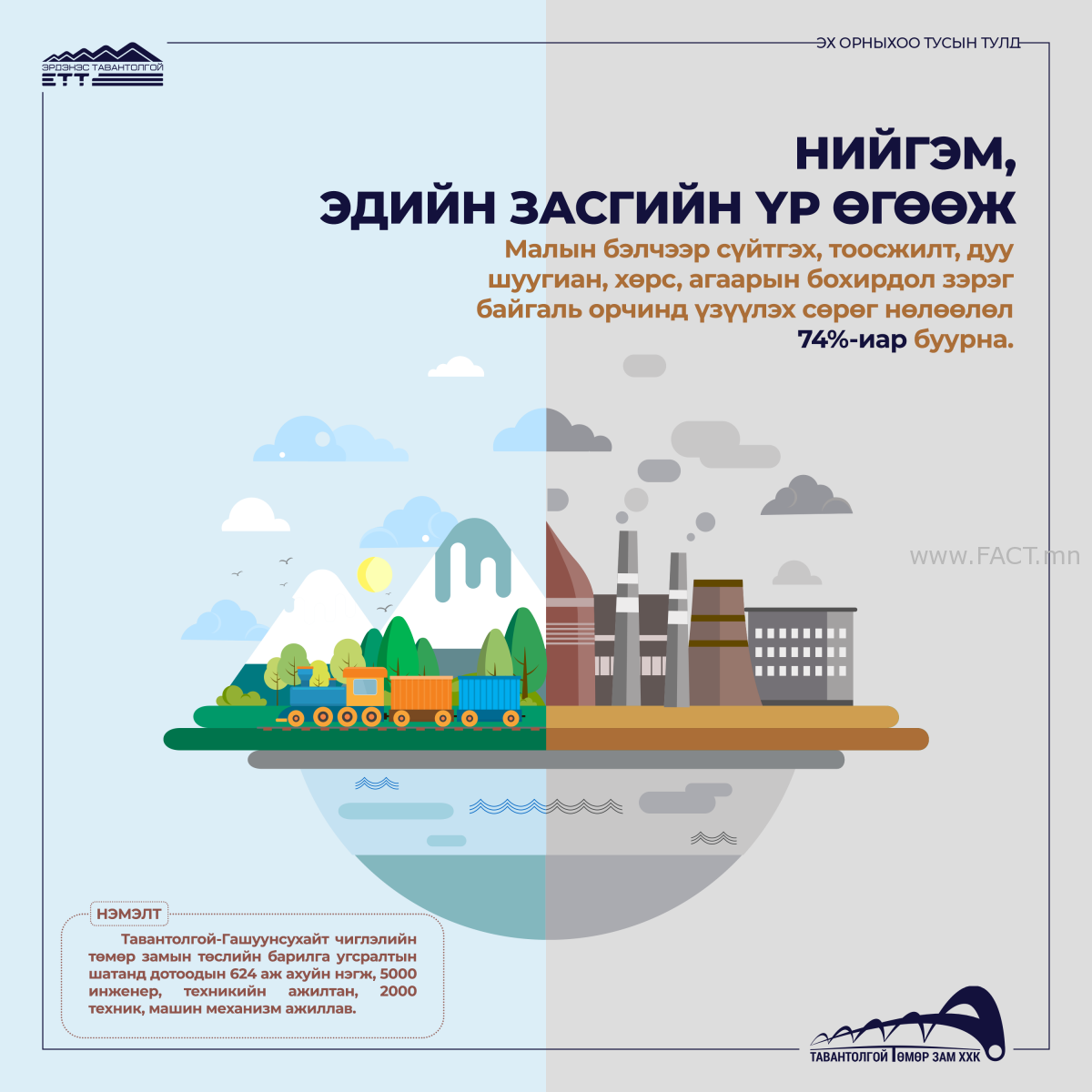 Малын бэлчээр сүйтгэх, тоосжилт, дуу шуугиан, хөрс, агаарын бохирдол зэрэг байгаль орчинд үзүүлэх сөрөг нөлөөлөл 74%-иар буурна.