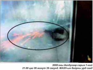 Долдугаар сарын 1-ний хэрэг явдалтай холбоотойгоор шинэ шинэ гаргалгааг хэвлэл мэдээллүүд гаргаж байна. Ийм нөхцөлд хэвлэл мэдээллийн бид л аль болох үнэнийг нийгэмд хүргэж байхгүй бол төөрөгдөл бий болох вий гэсэн болгоомжлол төрж эхэллээ. Та бүхэнд танилцуулж буй энэхүү гэрэл зургийг уншигч та тогтож анзаар. Хэдүй бүдэг ч гэсэн сайн хар. Бууны ам цухуйж байгаа биз. Бууных нь оосор доошоо унжсан байна. Аа бүр буу авалцаж гал манарч, утаа уугиж байна. Энэ бууны буудсан хугацаа нь оройн 21 цаг 6 минут 39 секунд гэж авсан гэрэл зургийнх нь аппаратад үлджээ. Гэхдээ энэ буу бол хаймран сумтай буу. Хүний амь насанд шууд нөлөөлдөггүй резинин сумтай. Энэ буугаар тэр өдрийн 15.00 цагийн орчмоос эхлэн жагсагчид руу буудаж эхэлсэн юм. Хонгио нь цаасан хонгио байдаг. Юу хэлэх гээд байна гэхээр сүүлийн үед зарим мэдээллийн хэрэгслээр тухайн үед АН-ын дарга байсан Ц.Элбэгдорж тэр орой улс төрийн намын дарга нарыг Ерөнхийлөгч Н.Энхбаяр цуглуулж уулзах үед бууны,сумны хонгио авч орж танилцуулсан. Тэгэхээр хүн буудахыг мань нөхөр урьдчилан мэдэж байжээ.