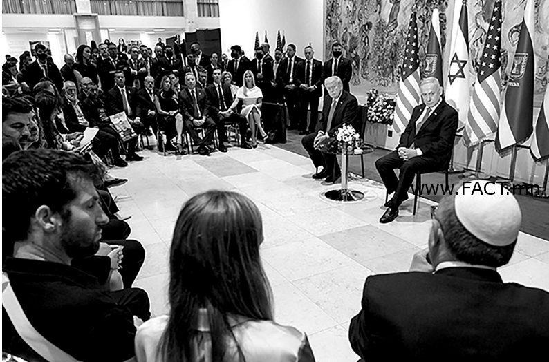 АНУ-ын Ерөнхийлөгч Дональд Трамп энэ сарын 13-ны өглөө Израилд хүрэлцэн ирэв. Тэрбээр Ерөнхийлөгчийн одоогийн бүрэн эрхээ хэрэгжүүлж эхэлснээс хойш төдийгүй өөрийнх нь санаачилгаар Иерусалим хотыг Израилын нийслэл хэмээн хүлээн зөвшөөрч, Америкийн элчин сайдын яамыг 2017 онд тийш нь нүүлгэснээс хойш еврейн улсад анх удаа айлчилж буй нь энэ. Израилд ердөө долоон цаг саатахдаа Ерөнхий сайд Беньямин Нетаньяху болон барьцаалагдсан хүмүүсийн гэр бүлийнхэн, шархадсан цэргүүдтэй уулзаж, парламент (Кнессет)-ын гишүүдэд нь хандаж үг хэлсэн байна. Трампыг Израилд ёстой л хөл алдаж угтав. “The Times of Israel” сонинд бичсэнээр бол Ерөнхий сайд Нетаньяху нь гэргийн хамт угтаж авсан төдийгүй АНУ-ын Ерөнхийлөгчийн машинд хамт сууж парламентын ордноо зорьсон нь олон улсад баримталдаг протоколыг зөрчсөн явдал гэж бичсэн байх юм.