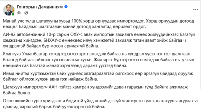 Шатахуун түгээх станцууд шатахууныг хязгаарлалттай болон огт олгохгүй хомсдол үүсэж буй. Үүнтэй холбоотойгоор Аж үйлдвэр, эрдэс баялгийн сайд Г.Дамдинням дараах мэдэгдлийг өөрийн цахим хуудаснаа нийтэлжээ.