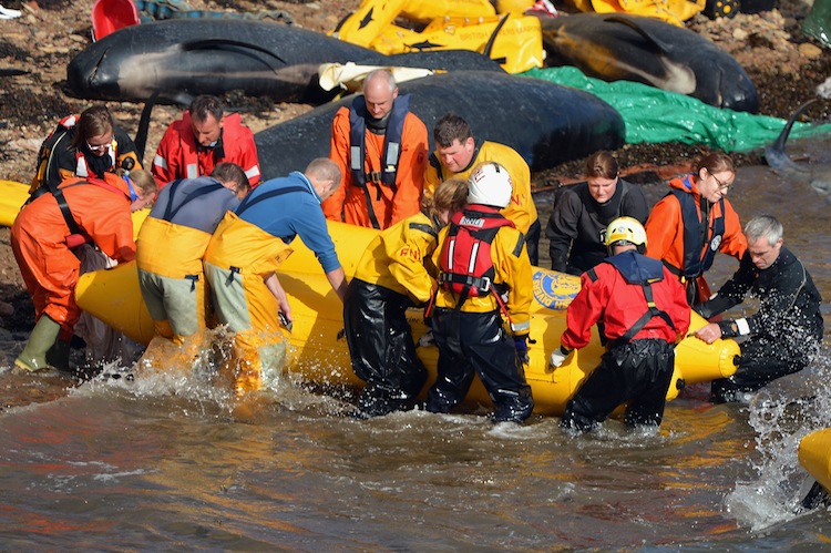 Эдгээр зургаан метрийн урттай сүүн тэжээлт халимнуудыг далайн усанд буцаан оруулах ажилд Шотландын цагдаа, Их Британийн усанд шумбагчид, нутгийн гал сөнөөгчид болон далайн амьтдыг аврах багийнхан хамтран оролцжээ.
