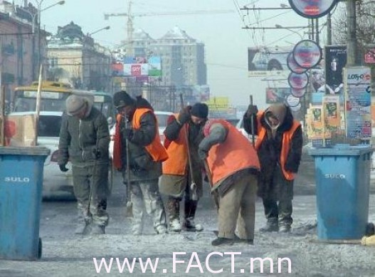 Харин манайхан цас ороод дагтаршаад гөлийсөн үед нь нүглийн нүдийг гурилаар хуурах гэж жаахан давс цацдаг. Харин энэ бүх халтиргаа гулгааг бууруулахын тул хэн нуруугаа бөхийтөл ажилладаг нь тодорхой. Нийслэлийн хэмжээнд зам талбай цэвэрлэх буюу тохижилт үйлчилгээний нийт 400 орчим ажилтан байдаг. Тэгэхээр нэг дүүрэгт 40 орчим хүн ажилладаг гэсэн үг. Нормоороо бол гадна талбайн нэг ажилчин өдөрт 1.3-1.5 мянган метр газар цэвэрлэж байх ёстой. Нэг хүн өдөрт ийм их зам талбай цэвэрлэнэ гэдэг арай л хэтийдсэн хэмжээ. Тэдний сарын цалин 200 гаруй мянган төгрөг бөгөөд ажилласан талбайгаараа үнэлэгдэж цалин нэмэгддэг байна.