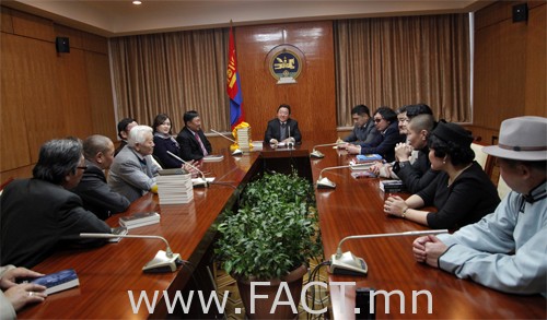 Уулзалтын үеэр зохиолч, яруу найрагчид уран бүтээлийн дээжээсээ Монгол Улсын Ерөнхийлөгчид өргөн барьцгааж дурсгалын зураг татууллаа.